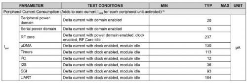 圖2顯示了TI CC2650MODA系列中可用外設(shè)的功耗。盡管各種設(shè)備消耗的電流非常小—僅幾十或幾百微安的程度—但是禁用這些設(shè)備可能會(huì)產(chǎn)生重大影響。如果不需要進(jìn)行串行連接,則可以節(jié)省總共318μA。雖然可能看起來(lái)不太多,但是這個(gè)電流變化會(huì)對(duì)電池壽命產(chǎn)生重大影響。